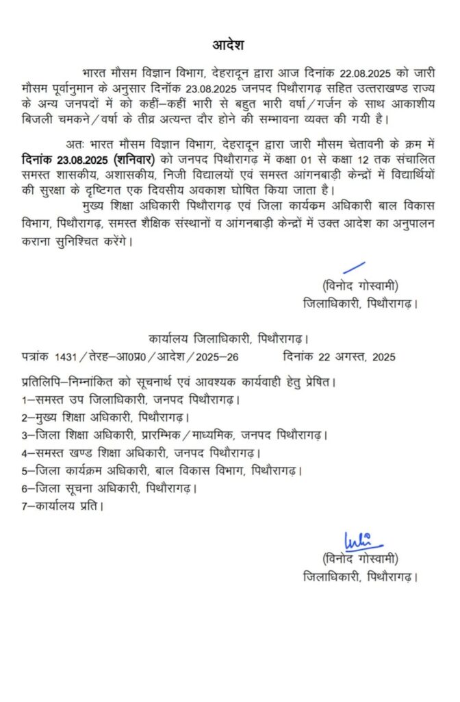 भारी बारिश की चेतावनी के दृष्टिकोण बागेश्वर और पिथौरागढ़ जनपदों मे स्कूलों में अवकाश घोषित किया गया है।