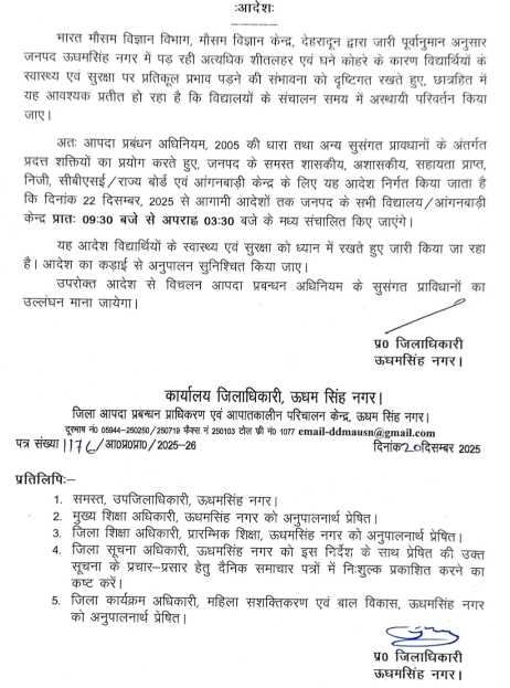 भारत मौसम विज्ञान विभाग, मौसम विज्ञान केन्द्र, देहरादून द्वारा जारी पूर्वानुमान अनुसार जनपद ऊधमसिंह नगर में पड़ रही अत्यधिक शीतलहर एवं घने कोहरे के कारण विद्यार्थियों के स्वास्थ्य एवं सुरक्षा पर प्रतिकूल प्रभाव पड़ने की संभावना को दृष्टिगत रखते हुए, छात्रहित में यह आवश्यक प्रतीत हो रहा है कि विद्यालयों के संचालन समय में अस्थायी परिवर्तन किया जाए।