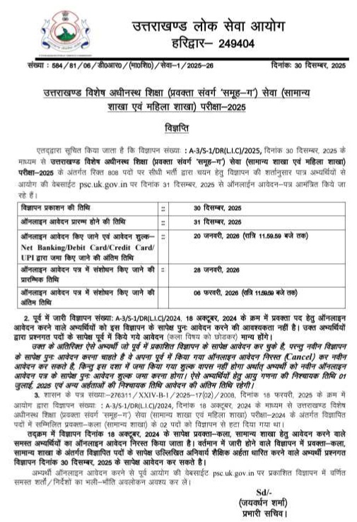 एतद्वारा सूचित किया जाता है कि विज्ञापन संख्याः: A-3/S-1/DR (L.I.C)/2025, दिनांक 30 दिसम्बर, 2025 के माध्यम से उत्तराखण्ड विशेष अधीनस्थ शिक्षा (प्रवक्ता संवर्ग समूह-ग) सेवा (सामान्य शाखा एवं महिला शाखा) परीक्षा-2025 के अंतर्गत रिक्त 808 पदों पर सीधी भर्ती द्वारा चयन हेतु विज्ञापन की शर्तानुसार पात्र अभ्यर्थियों से आयोग की वेबसाईट psc.uk.gov.in पर दिनांक 31 दिसम्बर, 2025 से ऑनलाईन आवेदन-पत्र आमंत्रित किये जा