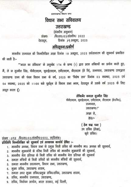 “भारत का संविधान’ के अनुच्छेद 174 के खण्ड (1) द्वारा प्रदत्त शक्तियों का प्रयोग करते हुए, मैं, ले ज गुरमीत सिंह, पीवीएसएम, यूवाईएसएम, एवीएसएम, वीएसएम (से नि), राज्यपाल, उत्तराखण्ड एतद्द्वारा उत्तराखण्ड राज्य की पंचम विधान सभा के वर्ष, 2025 का ‘विशेष सत्र’ दिनांक 03 नवम्बर, 2025 एवं 04 नवम्बर, 2025 को 11:00 बजे पूर्वाहन से विधान सभा भवन, देहरादून में उसके वर्ष 2025 के लिए आहूत करता हूँ।