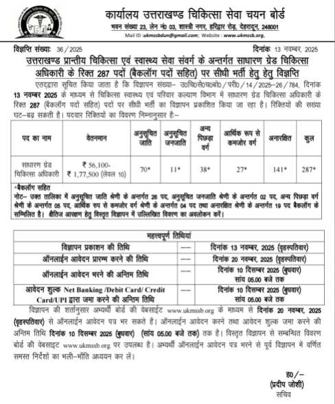 सूबे के चिकित्सा स्वास्थ्य एवं चिकित्सा शिक्षा मंत्री डॉ. धन सिंह रावत के निर्देश के उपरांत स्वास्थ्य विभाग द्वारा प्रांतीय चिकित्सा एवं स्वास्थ्य सेवा संवर्ग के अंतर्गत साधारण ग्रेड चिकित्सा अधिकारियों के रिक्त 287 पदों सीधी भर्ती हेतु राज्य चिकित्सा सेवा चयन बोर्ड को अधियाचन भेजा गया था, जिसमें 231 पद सीधी भर्ती और 56 बैकलॉग के पद शामिल हैं। उक्त के क्रम चयन बोर्ड ने आज चिकित्सा अधिकारियों रिक्त पदों को सीधी भर्ती से भरने हेतु भर्ती विज्ञप्ति जारी कर अभ्यर्थियों से आवेदन मांगे हैं।