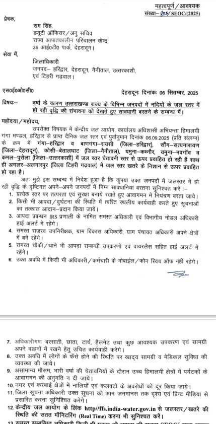 वर्षा के कारण उत्तराखण्ड राज्य के विभिन्न जनपदों में नदियों के जल स्तर में हो रही वृद्धि की संभावना को देखते हुए सावधानी बरतने के सम्बन्ध में।