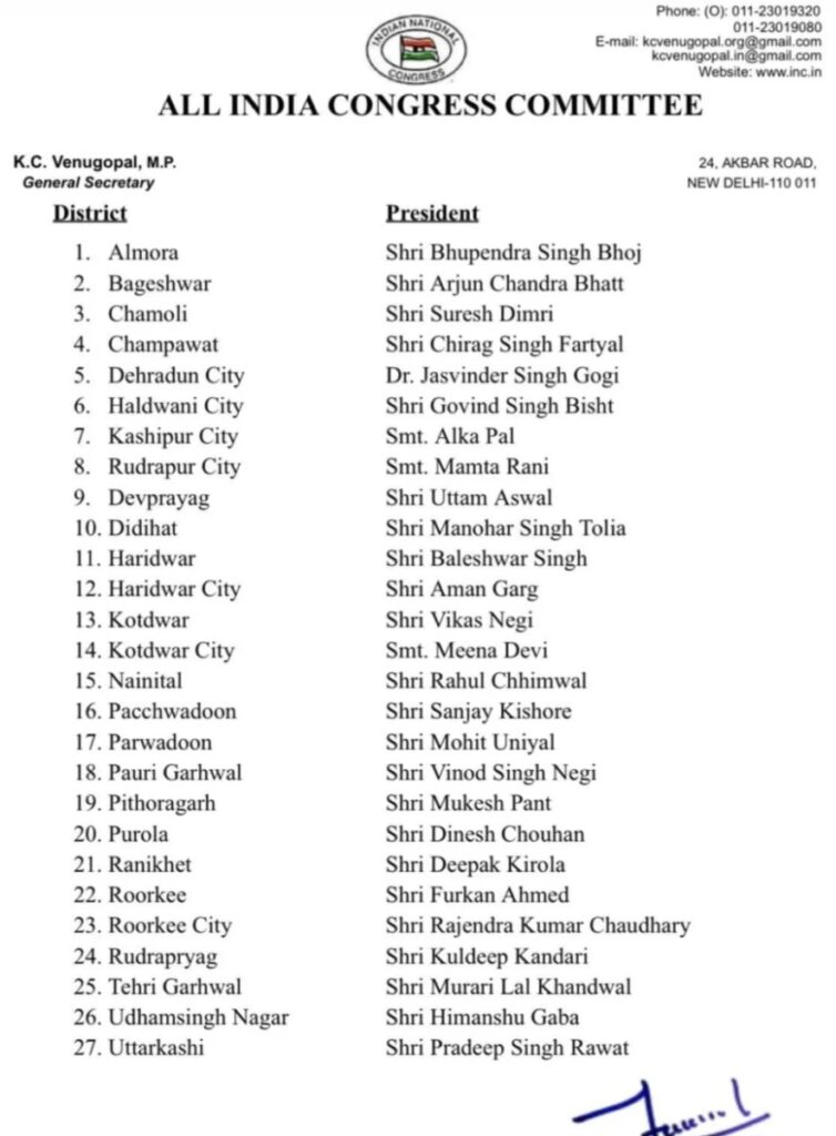 कांग्रेस पार्टी के जनरल सेक्रेटरी केसी वेणुगोपाल की ओर से जारी किए गए पत्र में चकराता से विधायक और पूर्व प्रदेश अध्यक्ष प्रीतम सिंह को कैंपेन कमेटी का चेयरमैन व पूर्व कैबिनेट मंत्री हरक सिंह रावत को इलेक्शन मैनेजमेंट कमेटी का अध्यक्ष नियुक्त किया है।