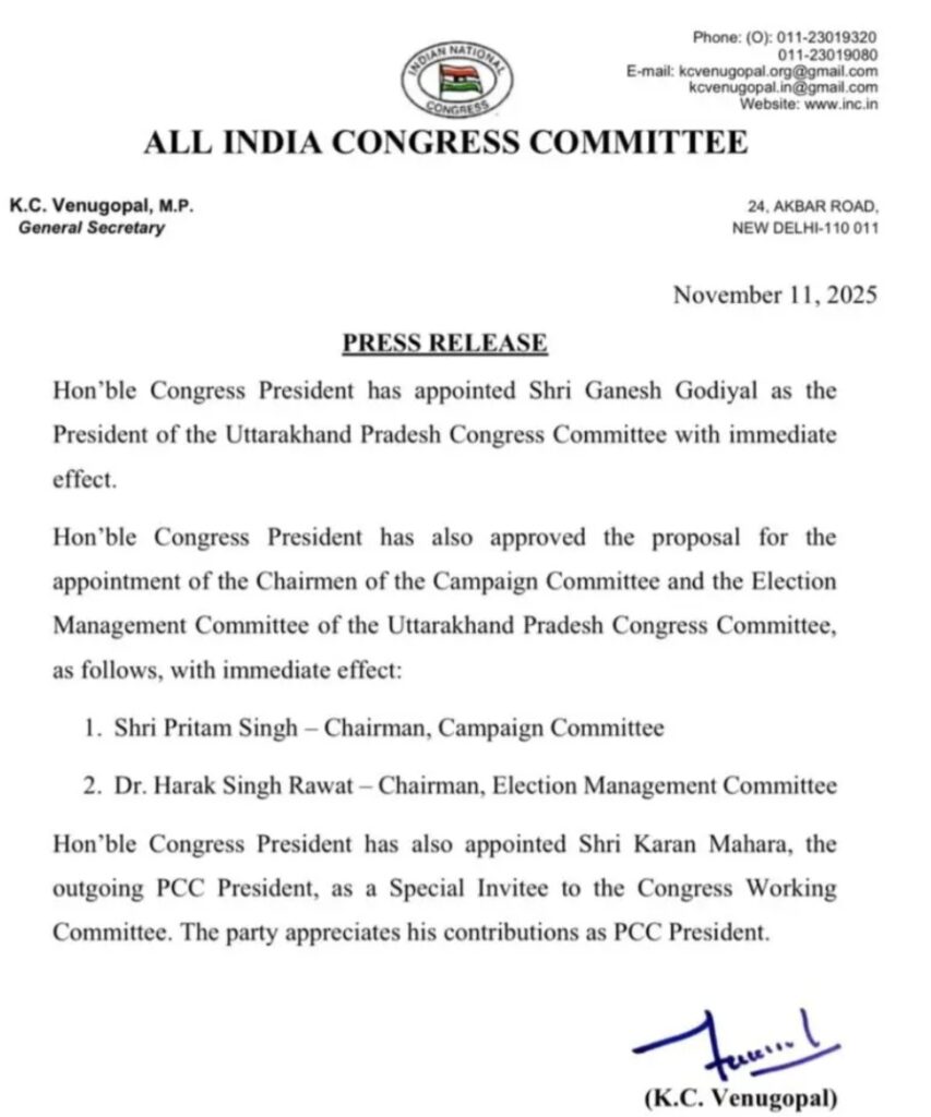 उत्तराखंड से प्रदेश कांग्रेस की बड़ी खबर है। ऑल इंडिया कांग्रेस कमेटी ने बड़ा फैसला लेते हुए कांग्रेस के प्रदेश अध्यक्ष करन माहरा की जगह पार्टी के वरिष्ठ नेता गणेश गोदियाल को उत्तराखंड प्रदेश कांग्रेस संगठन की कमान सौंप दी है।