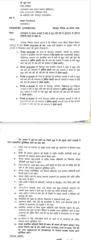 दिनांक 29.08.2025 को राज्य के देहरादून, रुद्रप्रयाग, चमोली एवं बागेश्वर, जनपदों में अत्यधिक वर्षा होने संभावना है (रेड अलर्ट) तथा उत्तराकाशी, हरिद्वार, पिथौरागढ़ चम्पावत एवं ऊधमसिंह नगर में भारी से बहुत भारी वर्षा होने की सम्भावना है (आरेंज अलर्ट) साथ ही अन्य शेष जनपदों में मध्यम से भारी बहुत भारी वर्षा होने की वर्षा होने की संभावना है (येलो अलर्ट)।