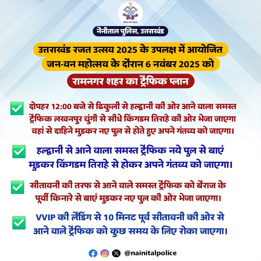 दोपहर 12:00 बजे से ढिकुली से हल्द्वानी की ओर आने वाला समस्त ट्रैफिक लखनपुर चुंगी से सीधे किंगडम तिराहे की ओर भेजा जाएगा वहां से दाहिने मुडकर नए पुल से होते हुए अपने गंतव्य को जाएगा।