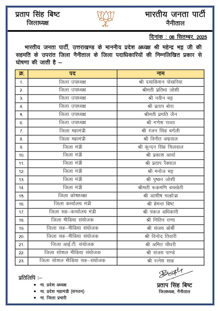 Corbetthalchal uttarakhand-भारतीय जनता पार्टी, उत्तराखण्ड के माननीय प्रदेश अध्यक्ष श्री महेन्द्र भट्ट जी की सहमति के उपरांत नैनीताल जिला पदाधिकारियों की निम्नलिखित प्रकार से घोषणा की जाती है