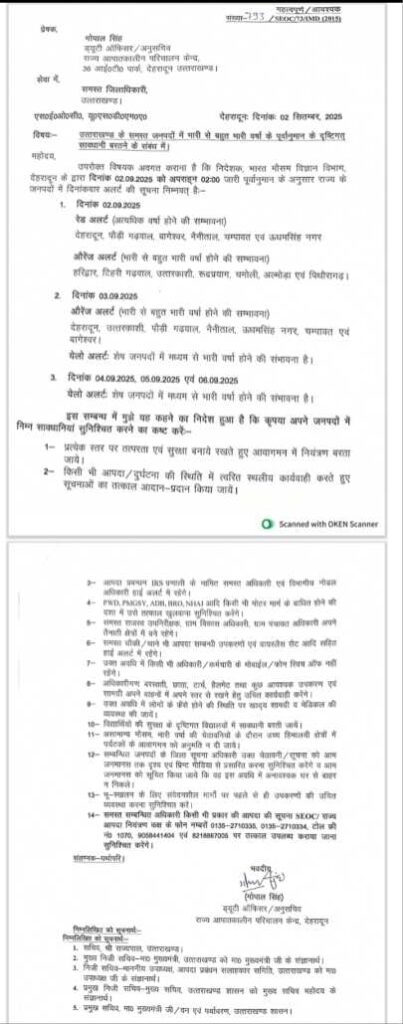 उपरोक्त विषयक अवगत कराना है कि निदेशक, भारत मौसम विज्ञान विभाग, देहरादून के द्वारा दिनांक 02.09.2025 को अपराह्न 02:00 जारी पूर्वानुमान के अनुसार राज्य के जनपदों में दिनांकवार अलर्ट की सूचना निम्नवत् है-