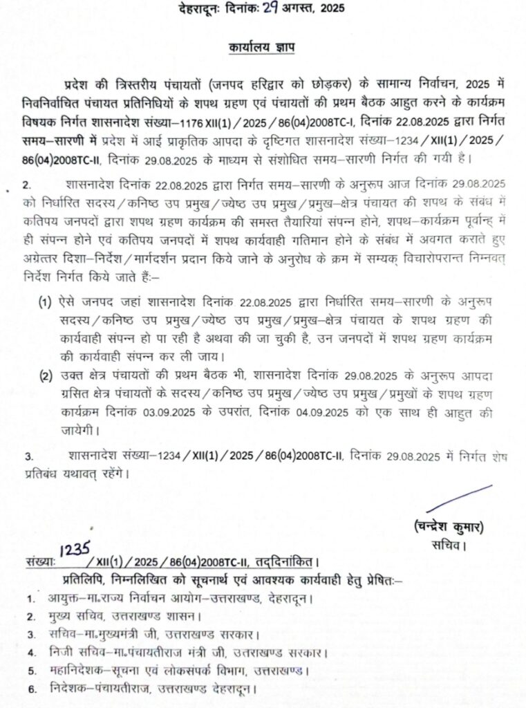 उपर्युक्त विषयक शासनादेश संख्या-1176/XII(1)/2025/86(04) 2008TC-1, दिनांक 22.08.2025 के द्वारा प्रदेश की त्रिस्तरीय पंचायतों (जनपद हरिद्वार को छोड़कर) के सामान्य निर्वाचन, 2025 में नवनिर्वाचित पंचायत पदाधिकारियों के परिप्रेक्ष्य में पंचायतों के गठन, शपथ ग्रहण एवं पंचायतों की प्रथम बैठक हेतु समय-सारणी निर्गत की गयी है।