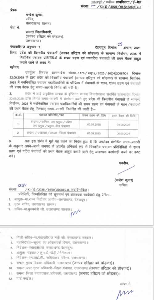 विषयः प्रदेश की त्रिस्तरीय पंचायतों (जनपद हरिद्वार को छोड़कर) के सामान्य निर्वाचन, 2025 में निर्वाचित पंचायत प्रतिनिधियों के शपथ ग्रहण एवं नवगठित पंचायतों की प्रथम बैठक आहुत कराये जाने के संबंध में।