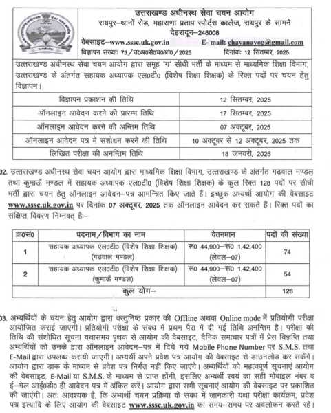 02. उत्तराखण्ड अधीनस्थ सेवा चयन आयोग द्वारा माध्यमिक शिक्षा विभाग, उत्तराखण्ड के अंतर्गत गढ़वाल मण्डल तथा कुमाऊँ मण्डल में सहायक अध्यापक एल०टी० (विशेष शिक्षा शिक्षक) के कुल रिक्त 128 पदों पर सीधी भर्ती द्वारा चयन हेतु ऑनलाइन आवेदन-पत्र आमन्त्रित किए जाते हैं। इच्छुक अभ्यर्थी आयोग की वेबसाइट www.sssc.uk.gov.in पर दिनांक 07 अक्टूबर, 2025 तक ऑनलाइन आवेदन कर सकते हैं। रिक्त पदों का संक्षिप्त विवरण निम्नवत् है-