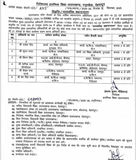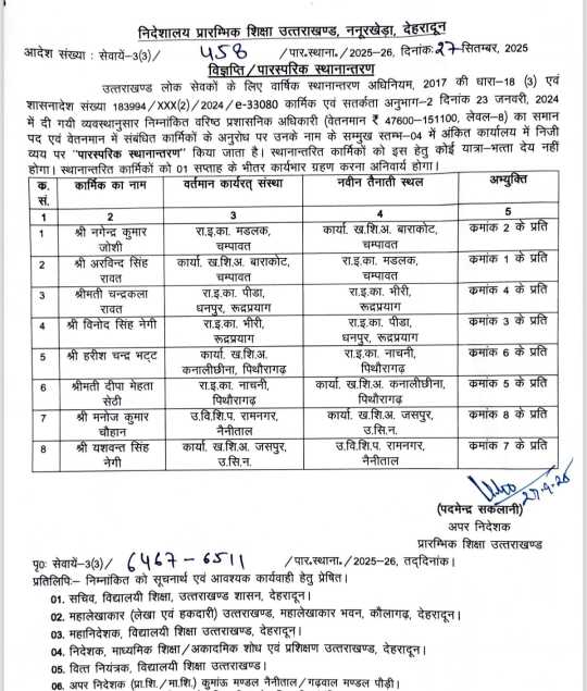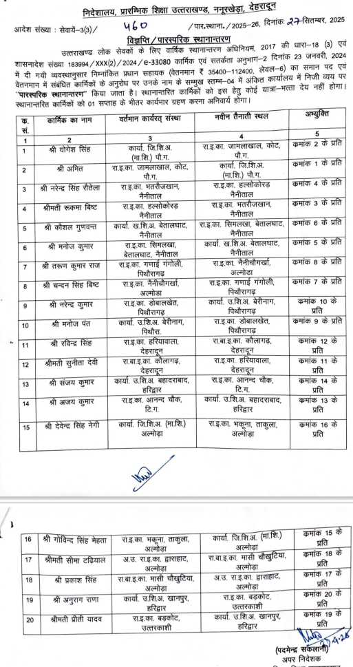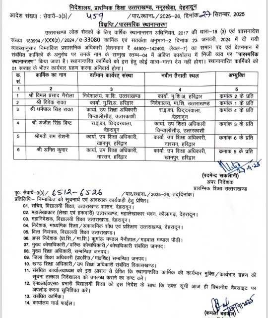 उत्तराखण्ड लोक सेवकों के लिए वार्षिक स्थानान्तरण अधिनियम, 2017 की धारा-18 (3) एवं शासनादेश संख्या 183994/XXX(2)/2024/e-33080 कार्मिक एवं सतर्कता अनुभाग-2 दिनांक 23 जनवरी, 2024 में दी गयी व्यवस्थानुसार निम्नांकित प्रधान सहायक (वेतनमान ₹ 35400-112400, लेवल-6) का समान पद एवं वेतनमान में संबंधित कार्मिकों के अनुरोध पर उनके नाम के सम्मुख स्तम्भ-04 में अंकित कार्यालय में निजी व्यय पर ‘पारस्परिक स्थानान्तरण किया जाता है। स्थानान्तरित कार्मिकों को इस हेतु कोई यात्रा-भत्ता देय नहीं होगा। स्थानान्तरित कार्मिकों को 01 सप्ताह के भीतर कार्यभार ग्रहण करना अनिवार्य