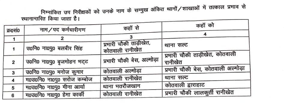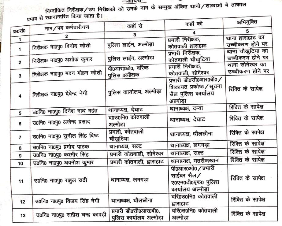 वरिष्ठ पुलिस अधीक्षक अल्मोड़ा श्री देवेन्द्र पींचा द्वारा जनपद में पुलिसिंग और जनसंपर्क को बेहतर बनाने एवं कानून व्यवस्था को और अधिक सुदृढ़ एवं प्रभावी बनाने के उद्देश्य से थानाध्यक्षों/चौकी प्रभारियों के तबादले किए गए हैं। साथ ही नवसर्जित कोतवाली सोमेश्वर,द्वाराहाट व चौखुटिया में प्रभारी निरीक्षकों को जिम्मेदारी सौपी गयी।