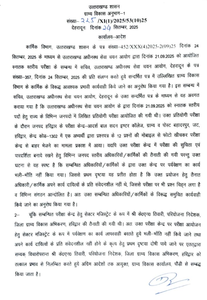 कार्मिक विभाग, उत्तराखण्ड शासन के पत्र संख्या-452/XXX (4)2025-2(09)25 दिनांक 24 सितम्बर, 2025 के माध्यम से उत्तराखण्ड अधीनस्थ सेवा चयन आयोग द्वारा दिनांक 21.09.2025 को आयोजित स्नातक स्तरीय परीक्षा के सम्बन्ध में सचिव, उत्तराखण्ड अधीनस्थ सेवा चयन आयोग, देहरादून के पत्र संख्या-357, दिनांक 24 सितम्बर, 2025 की प्रति संलग्न करते हुये सन्दर्भित पत्र में उल्लिखित ग्राम्य विकास विभाग के कार्मिक के विरूद्ध आवश्यक प्रभावी कार्यवाही किये जाने का अनुरोध किया गया है।