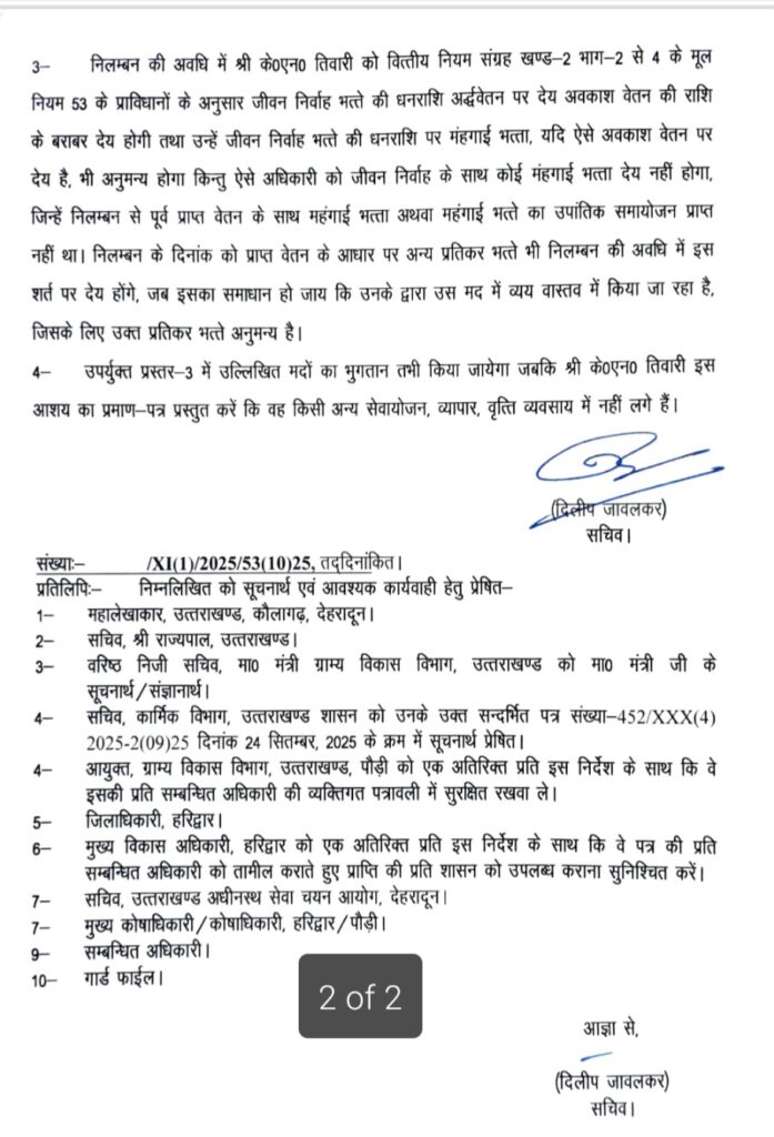 2-चूंकि सम्बन्धित परीक्षा केन्द्र हेतु सेक्टर मजिस्ट्रेट के रूप में श्री के०एन० तिवारी, परियोजना निदेशक, जिला ग्राम्य विकास अभिकरण, हरिद्वार की तैनाती की गयी थी। अतः उक्त परीक्षा केन्द्र पर परीक्षा आयोजन हेतु सेक्टर मजिस्ट्रेट के रूप में पर्यवेक्षण का कार्य लापरवाही बरतते हुये भली-भाँति नहीं किये जाने तथा अपने कार्य दायित्वों के प्रति संवेदनशील नहीं होने के कृत्य हेतु प्रथम दृष्टया दोषी पाये जाने पर एतत्द्वारा सम्यक विचारोपरान्त श्री के०एन० तिवारी, परियोजना निदेशक, जिला ग्राम्य विकास अभिकरण, हरिद्वार को तत्काल प्रभाव से निलम्बित करते हुये अग्रिम आदेशों तक आयुक्त, ग्राम्य विकास कार्यालय, पौड़ी से सम्बद्ध किया जाता है।