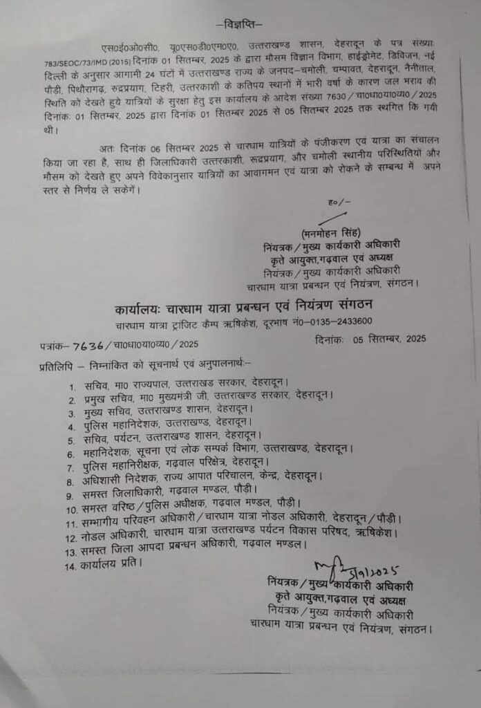 अतः दिनांक 06 सितम्बर 2025 से चारधाम यात्रियों के पंजीकरण एवं यात्रा का संचालन किया जा रहा है, साथ ही जिलाधिकारी उत्तरकाशी, रुद्रप्रयाग, और चमोली स्थानीय परिस्थितियों और मौसम को देखते हुए अपने विवेकानुसार यात्रियों का आवागमन एवं यात्रा को रोकने के सम्बन्ध में अपने स्तर से निर्णय ले सकेगें।