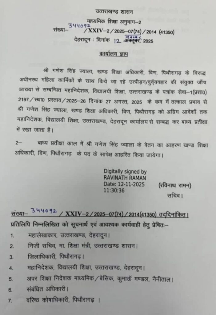 श्री गणेश सिंह ज्याला, खण्ड शिक्षा अधिकारी, विण, पिथौरागढ़ के विरुद्ध अधीनस्थ महिला कार्मिकों के साथ किये जा रहे उत्पीड़न दुव्यवहार की संयुक्त जाँच आख्या से सम्बन्धित महानिदेशक, विद्यालयी शिक्षा, उत्तराखण्ड के पत्रांक सेवा-1 (प्रशा०) 2197/ स्था० प्रस्ताव/2025-26 दिनांक 27 अगस्त, 2025 के कम में तत्काल प्रभाव से श्री गणेश सिंह ज्याला, खण्ड शिक्षा अधिकारी, विण, पिथौरागढ़ को अग्रिम आदेशों तक महानिदेशक, विद्यालयी शिक्षा, उत्तराखण्ड, देहरादून कार्यालय से सम्बद्ध कर बाध्य प्रतीक्षा में रखा जाता है।