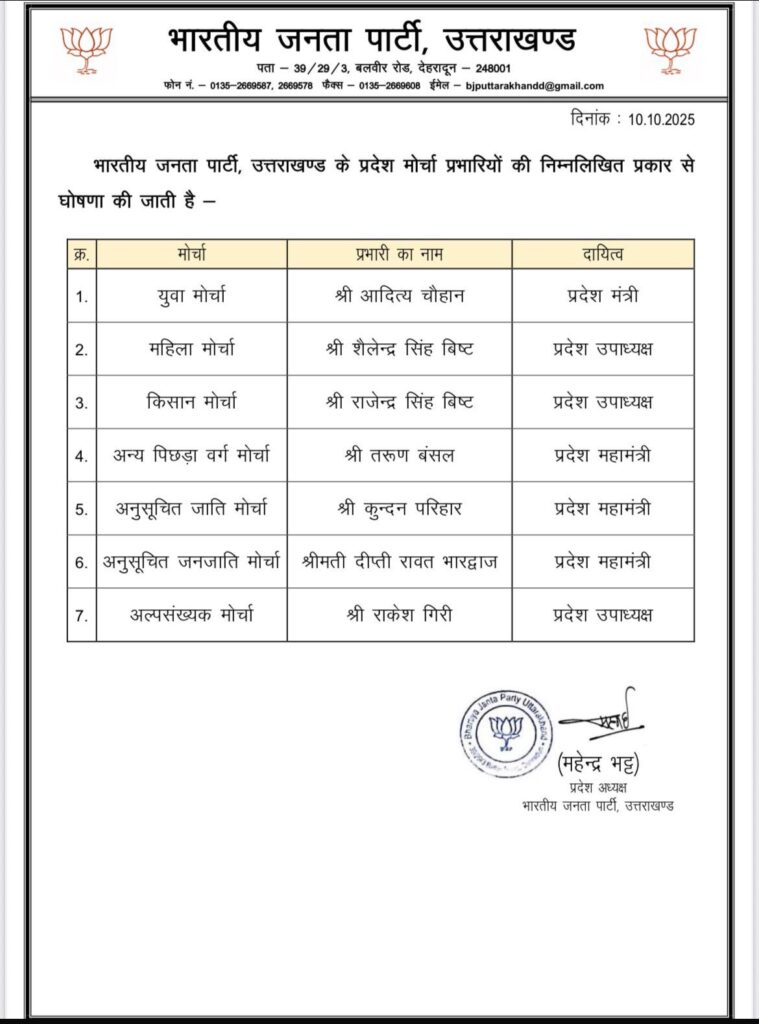 प्रदेशाध्यक्ष द्वारा तय जिम्मेदारी के तहत, युवा मोर्चा के लिए प्रदेश मंत्री श्री आदित्य चौहान, महिला मोर्चा के लिए प्रदेश उपाध्यक्ष श्री शैलेंद्र बिष्ट, किसान मोर्चा के लिए प्रदेश उपाध्यक्ष श्री राजेंद्र बिष्ट, अन्य पिछड़ा वर्ग मोर्चा के लिए प्रदेश महामंत्री श्री तरुण बंसल, अनुसूचित जाति मोर्चा के लिए प्रदेश महामंत्री श्री कुंदन परिहार अनुसूचित जनजाति मोर्चा के लिए प्रदेश महामंत्री श्रीमती दीप्ति रावत और अल्पसंख्यक मोर्चा के लिए प्रदेश उपाध्यक्ष श्री राकेश गिरी प्रभारी के दायित्व का निर्वहन करेंगे।