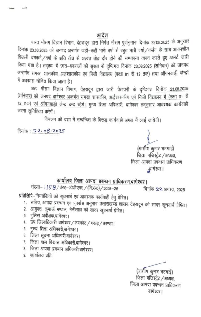 जनपद में गतिमान वर्षा के मध्येनजर किसी भी संभावित आपदा की गंभीरता को देखते हुए बागेश्वर जिलाधिकारी महोदय के निर्देशों के क्रम में जनपद बागेश्वर के समस्त शासकीय, अशासकीय एवं निजी विद्यालय (कक्षा 1 से 12 तक) एवं आंगनबाड़ी केंद्रों में दिनांक 23 अगस्त 2025 (शनिवार) को अवकाश रहेगा l
