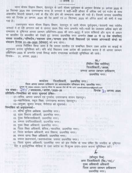 उक्तांनुसार भारत मौसम विज्ञान विभाग, देहरादून से जारी मौसम पूर्वानुमान/चेतावनी तथा पर्वतीय जनपदों में हो रही लगातार वर्षा से जनपद ऊधम सिंह नगर अन्तर्गत नदी-नालों का जलस्तर अधिक बढ़ने की सम्भावना के दृष्टिगत आपदा प्रबन्धन अधिनियम-2005 की धारा-30(2) में प्रदत्त शक्तियों और कृत्य के आधार पर छात्रहित एवं बाल्यहित को देखते हुए जनपद ऊधमसिंह नगर अन्तर्गत (कक्षा 01 से 12 तक संचालित) समस्त राजकीय/परिषदीय/सहायता प्राप्त/मान्यता प्राप्त निजी विद्यालयों एवं समस्त आंगनबाडी केन्द्रो का संचालन दिनांक 01-09-2025 (सोमवार) को बन्द रहेगा।