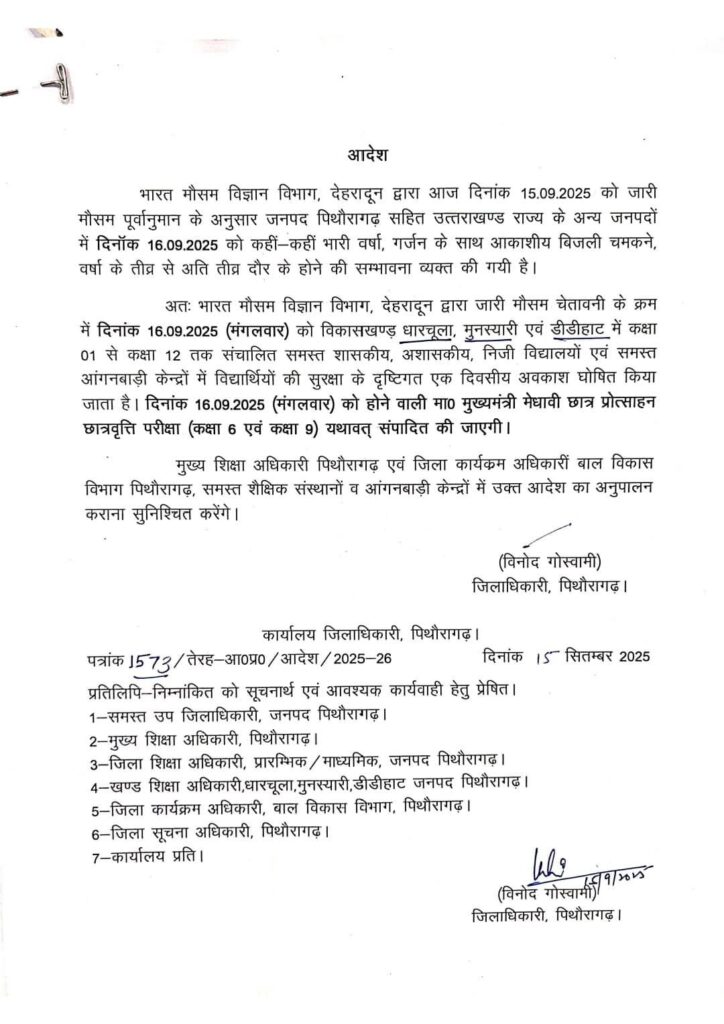 Corbetthalchal weather Pithoragarh-मौसम विज्ञान केंद्र, देहरादून के अनुसार पिथौरागढ़ जनपद में भारी से बहुत भारी बारिश का पूर्वानुमान है। इसके मद्देनजर पिथौरागढ़ जनपद के विकास खंड धारचूला, मुनस्यारी व डीडीहाट में 16 सितम्बर 2025 (मंगलवार) को 1 से 12वीं कक्षा तक के विद्यालयों और आंगनबाड़ी केंद्रों में अवकाश घोषित किया गया है। पढ़िये आदेश