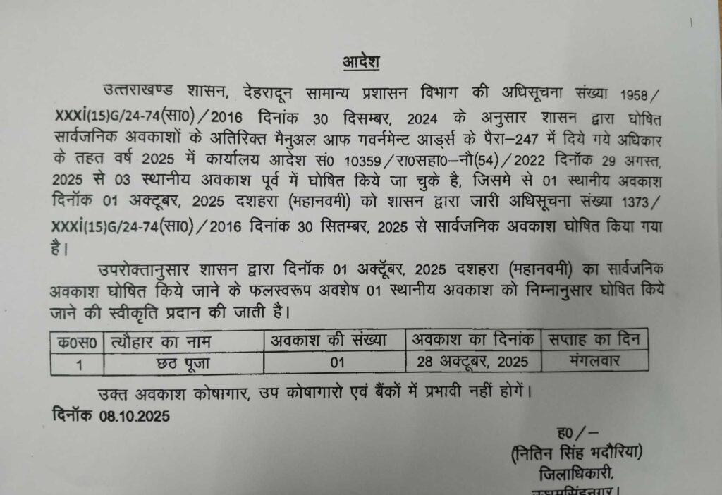 2025 में कार्यालय आदेश सं0 10359/ रा०सहा०-नौ (54) / 2022 दिनॉक 29 अगस्त, 2025 से 03 स्थानीय अवकाश पूर्व में घोषित किये जा चुके है, जिसमे से 01 स्थानीय अवकाश दिनाँक 01 अक्टूबर, 2025 दशहरा (महानवमी) को शासन द्वारा जारी अधिसूचना संख्या 1373/XXXİ (15)G/24-74 (सा0) /2016 दिनांक 30 सितम्बर, 2025 से सार्वजनिक अवकाश घोषित किया गया है।