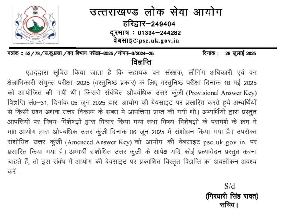 अभ्यर्थियों द्वारा प्रस्तुत आपत्तियों पर विषय विशेषज्ञों द्वारा विचार किया गया तथा विषय विशेषज्ञों के परामर्श के क्रम में मा० आयोग द्वारा औपबंधिक उत्तर कुंजी दिनांक 06 जून 2025 में संशोधन किया गया है। उपरोक्त संशोधित उत्तर कुंजी (Amended Answer Key) को आयोग की वेबसाइट psc.uk.gov.in पर प्रसारित किया गया है।