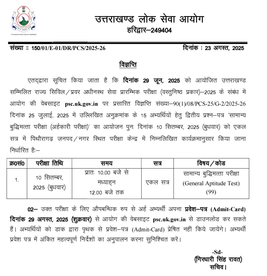 एतद्वारा सूचित किया जाता है कि दिनांक 29 जून, 2025 को आयोजित उत्तराखण्ड सम्मिलित राज्य सिविल / प्रवर अधीनस्थ सेवा प्रारम्भिक परीक्षा (वस्तुनिष्ठ प्रकार)-2025 के संबंध में आयोग की वेबसाइट psc.uk.gov.in पर प्रसारित विज्ञप्ति संख्या-90(1)/08/PCS-25/G-2/2025-26 दिनांक 25 जुलाई, 2025 में उल्लिखित अनुक्रमांक के 15 अभ्यर्थियों हेतु द्वितीय प्रश्न-पत्र ‘सामान्य बुद्धिमत्ता परीक्षा (अर्हकारी परीक्षा) का आयोजन पुन दिनांक 10 सितम्बर, 2025 (बुधवार) को एकल सत्र में पिथौरागढ़ जनपद / नगर स्थित परीक्षा केन्द्र में निम्नलिखित कार्यक्रमानुसार किया जाना निर्धारित है-