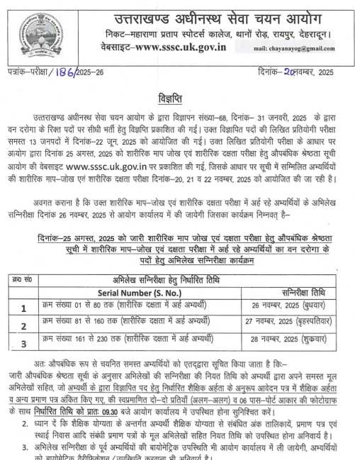उक्त लिखित प्रतियोगी परीक्षा के आधार पर आयोग द्वारा दिनांक 25 अगस्त, 2025 को शारीरिक माप जोख एवं शारीरिक दक्षता परीक्षा हेतु औपबंधिक श्रेष्ठता सूची आयोग की वेबसाइट www.sssc.uk.gov.in पर प्रकाशित की गई, जिसके आधार पर सूची में सम्मिलित अभ्यर्थियों की शारीरिक माप-जोख एवं शारीरिक दक्षता परीक्षा दिनांक 20, 21 व 22 नवम्बर, 2025 को आयोजित की जा रही है।