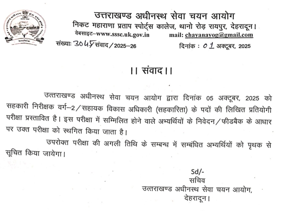 उत्तराखण्ड अधीनस्थ सेवा चयन आयोग द्वारा दिनांक 05 अक्टूबर, 2025 को सहकारी निरीक्षक वर्ग-2/ सहायक विकास अधिकारी (सहकारिता) के पदों की लिखित प्रतियोगी परीक्षा प्रस्तावित है। इस परीक्षा में सम्मिलित होने वाले अभ्यर्थियों के निवेदन/फीडबैक के आधार पर उक्त परीक्षा को स्थगित किया जाता है।