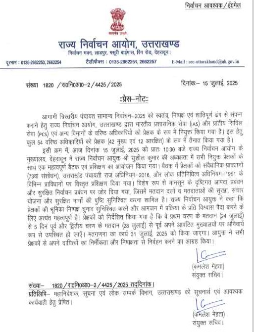 Corbetthalchal आगामी त्रिस्तरीय पंचायत सामान्य निर्वाचन-2025 को स्वतंत्र, निष्पक्ष एवं शांतिपूर्ण ढंग से संपन्न कराने हेतु राज्य निर्वाचन आयोग, उत्तराखण्ड द्वारा भारतीय प्रशासनिक सेवा (IAS) और प्रांतीय सिविल सेवा (PCS) एवं अन्य विभागों के वरिष्ठ अधिकारियों को प्रेक्षक के रूप में नियुक्त किया गया है। इस हेतु कुल 54 वरिष्ठ अधिकारियों को प्रेक्षक (42 मुख्य एवं 12 आरक्षित) के रूप में तैनात किया गया है।