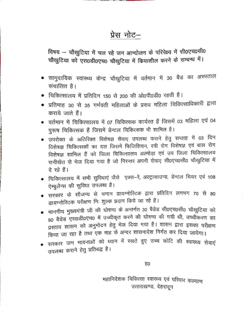 इस संबंध में मुख्यमंत्री श्री पुष्कर सिंह धामी द्वारा सी.एच.सी. चौखुटिया को 300 बेडेड एस.डी.एच. में बदलने की घोषणा की गई है तथा इसके शासनादेश की कार्यवाही शासन स्तर पर गतिमान है।