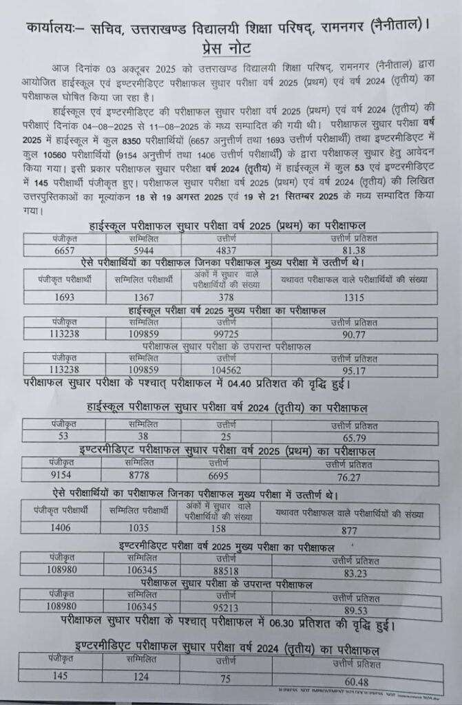 लंबे इंतजार और कई बाधाओं के बाद आखिरकार उत्तराखंड बोर्ड ने हाईस्कूल और इंटरमीडिएट की अंक सुधार परीक्षा का परिणाम घोषित कर दिया है। हाईस्कूल में 81.38% और इंटरमीडिएट में 76% छात्र-छात्राएं पास हुए हैं।