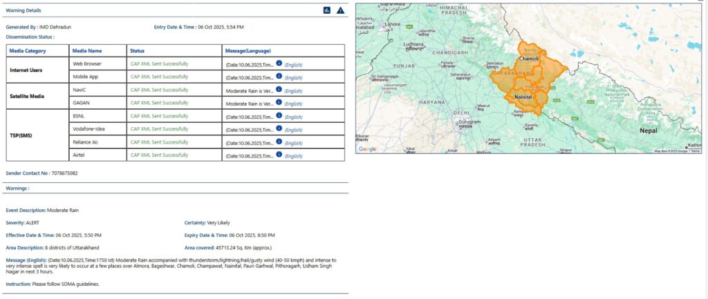 जनपद – अल्मोडा, बागेश्वर, चमोली, चंपावत, नैनीताल, पौडी गढ़वाल, पिथौरागढ, उधम सिंह नगर में अलग-अलग स्थानों पर यथा-बद्रीनाथजी, थराली, कर्णप्रयाग, मुनस्यारी, दुग्तु, डीडीहाट, गंगोलीहाट, बेरीनाग, टनकपुर, रुद्रपुर, मुक्तेश्वर, कोटद्वार, रानीखेत चौखुटिया तथा इनके आस पास के क्षेत्र में मध्यम वर्षा के साथ आंधी/बिजली/ओलावृष्टि/तेज हवा (40-50 किमी प्रति घंटा) और तीव्र से बहुत तीव्र दौर होने की संभावना है।
