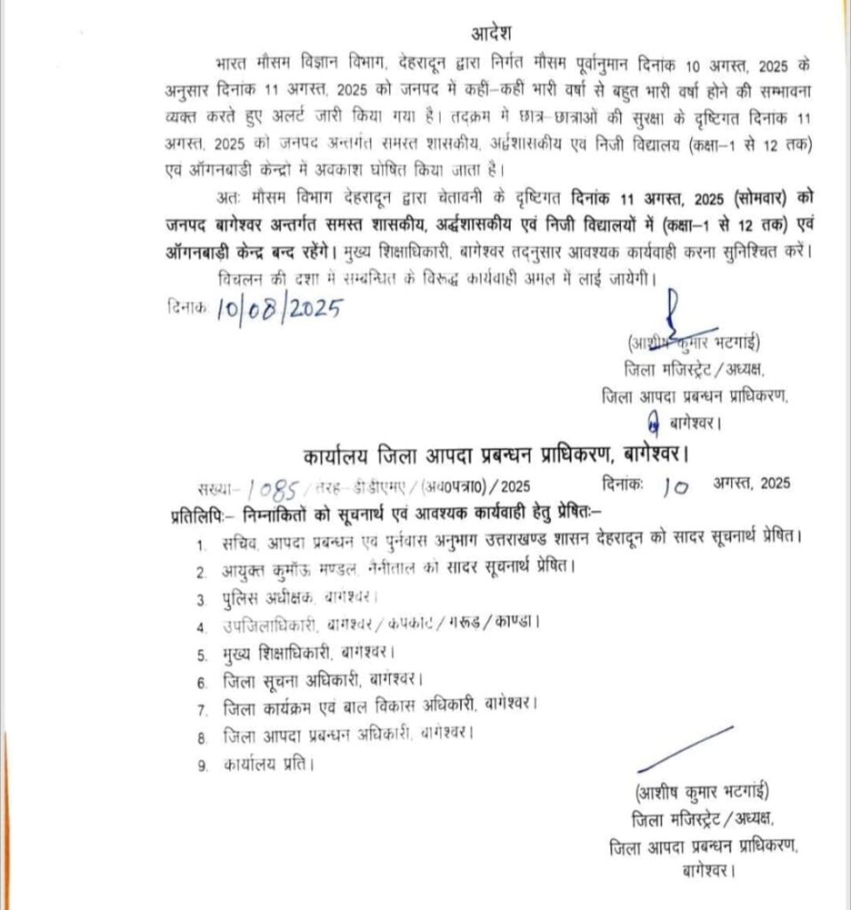 वहीं राज्य के बागेश्वर जनपद भारी बारिश की संभावना के दृष्टिकोण सोमवार को स्कूलों अवकाश घोषित किया गया है।
